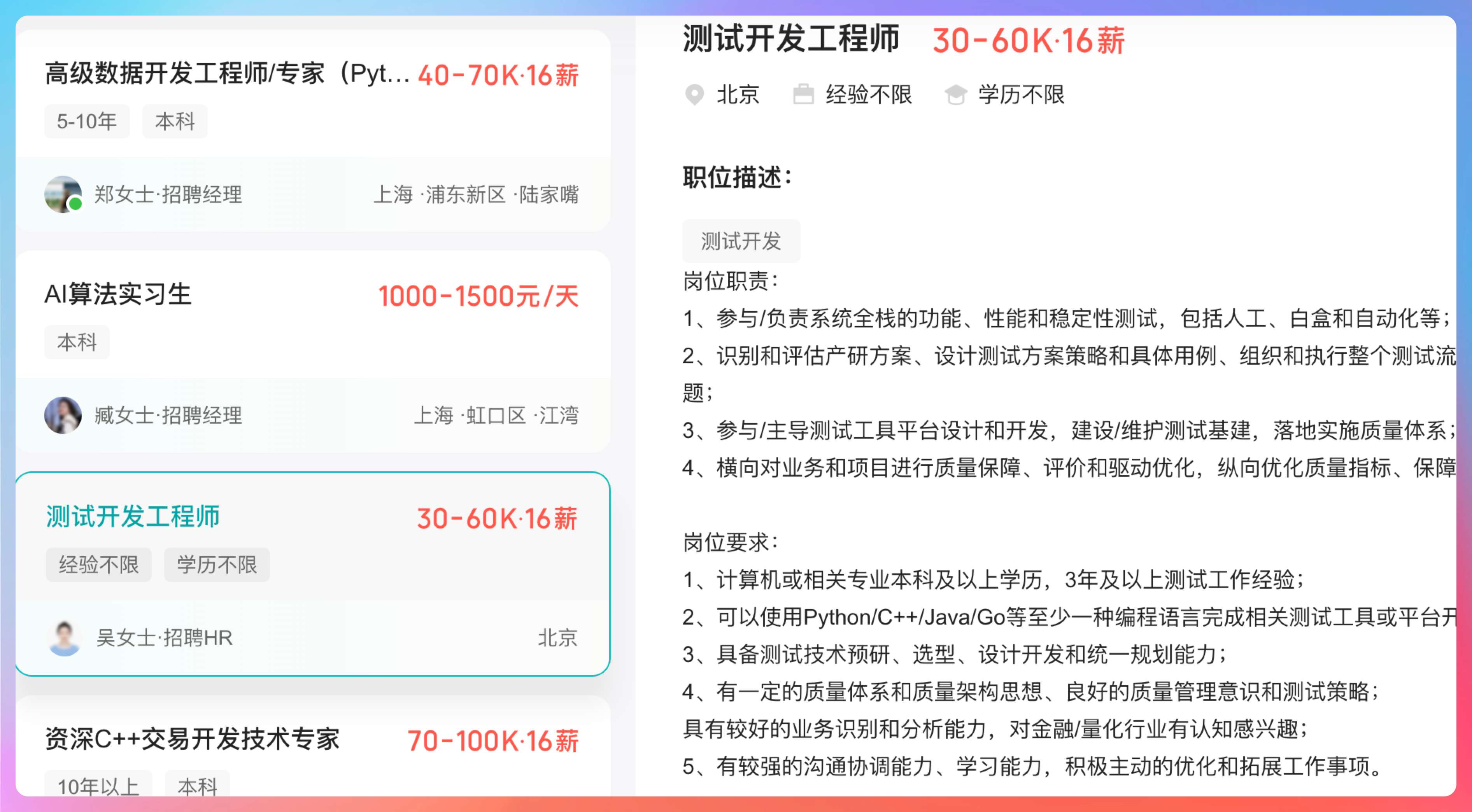 作为大家的求职工具人,我上老板直骗上瞅了一眼,目前 九坤在招的技术岗位有 102 个,其中测试开发工程师就能开到 30-60k。