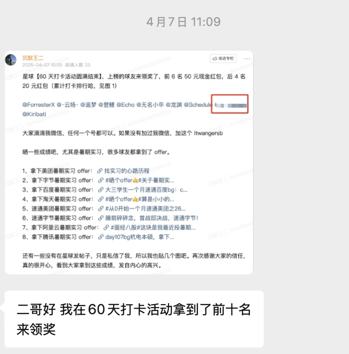 60 天打卡活动结束,榜上有名,也顺利拿到了暑期实习 offer。