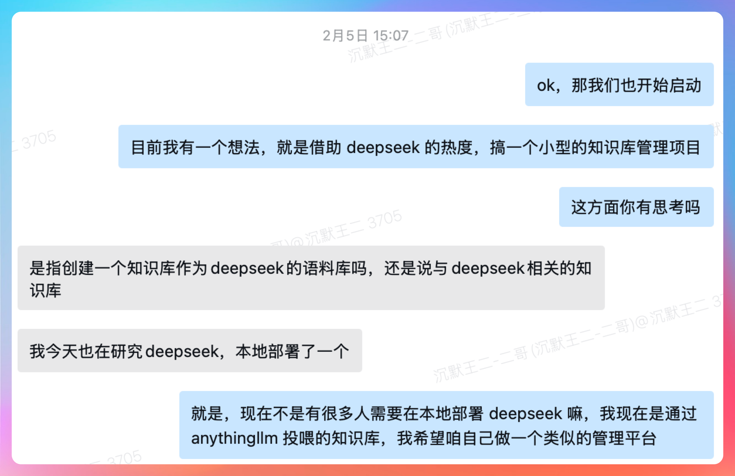 说句题外话,我也是在 DeepSeek 爆发的时候,打算要做一个 RAG 知识库的。给大家看一下我当时和技术合伙人雷哥的聊天记录。
