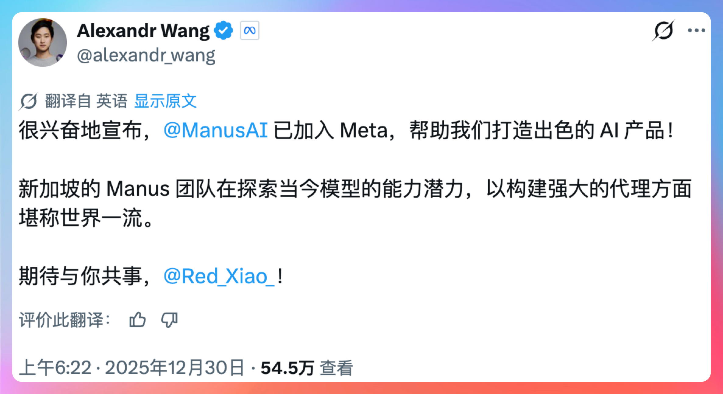 Manus 从 2025 年 3 月横空出世被很多人吹捧,再到 6 月份约 40 名核心技术搬迁新加坡被很多人吐槽,再到 12 月被收购,可以说已经创造了奇迹。