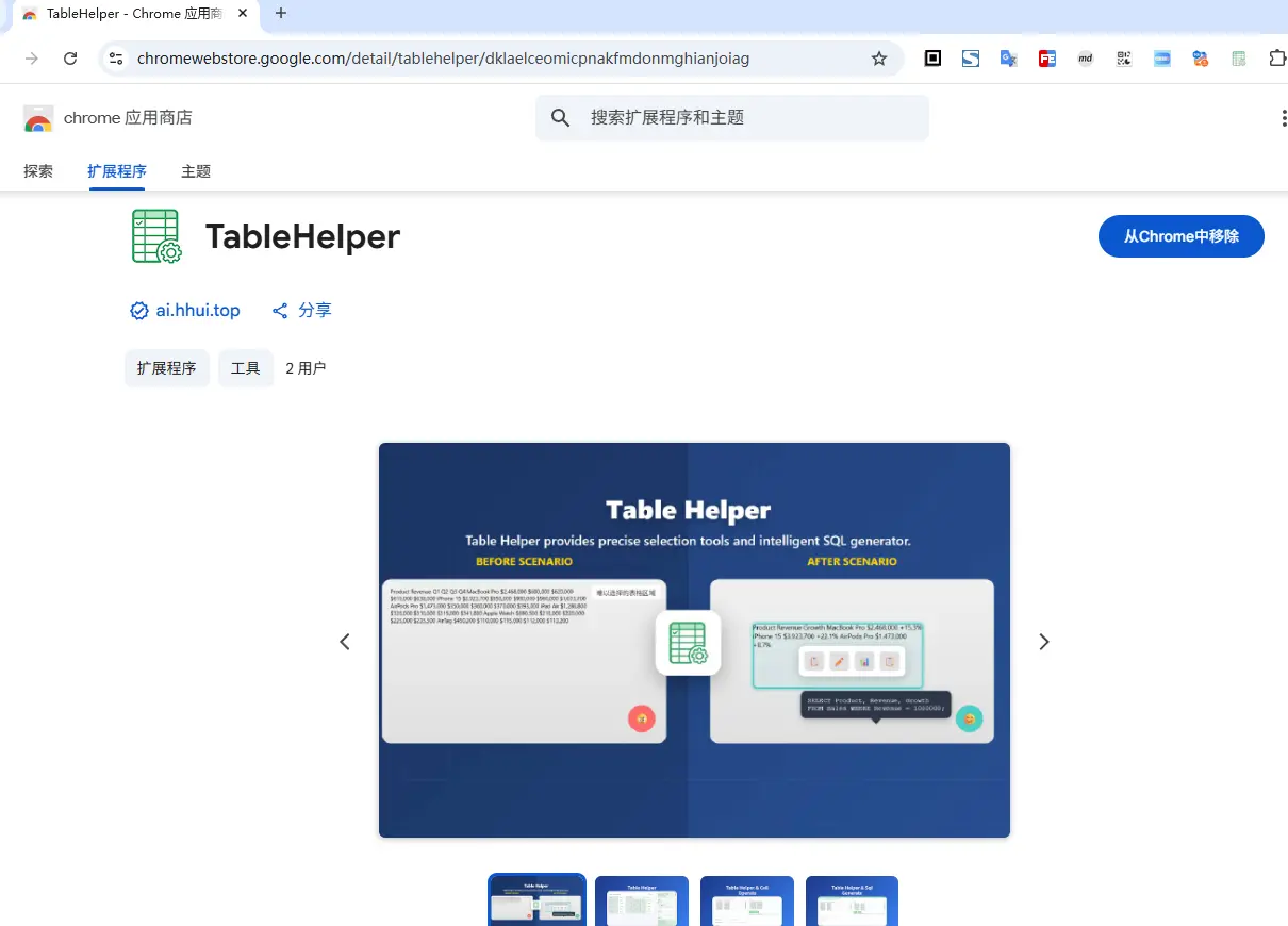 - 打开Chrome浏览器,进入扩展商店,或者直接进入插件详情 TableHelper: https://chromewebstore.google.com/detail/tablehelper/dklaelceomicpnakfmdonmghianjoiag