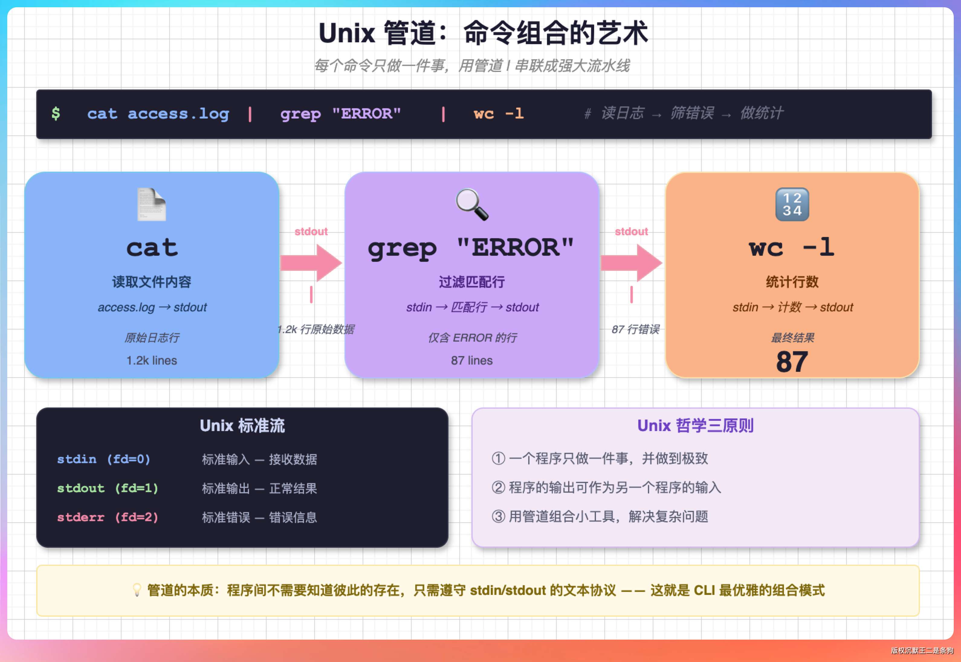 Unix 很早就把 CLI 的底层逻辑定下来了:每个程序只做一件事,程序之间的协作用文本做通用接口。