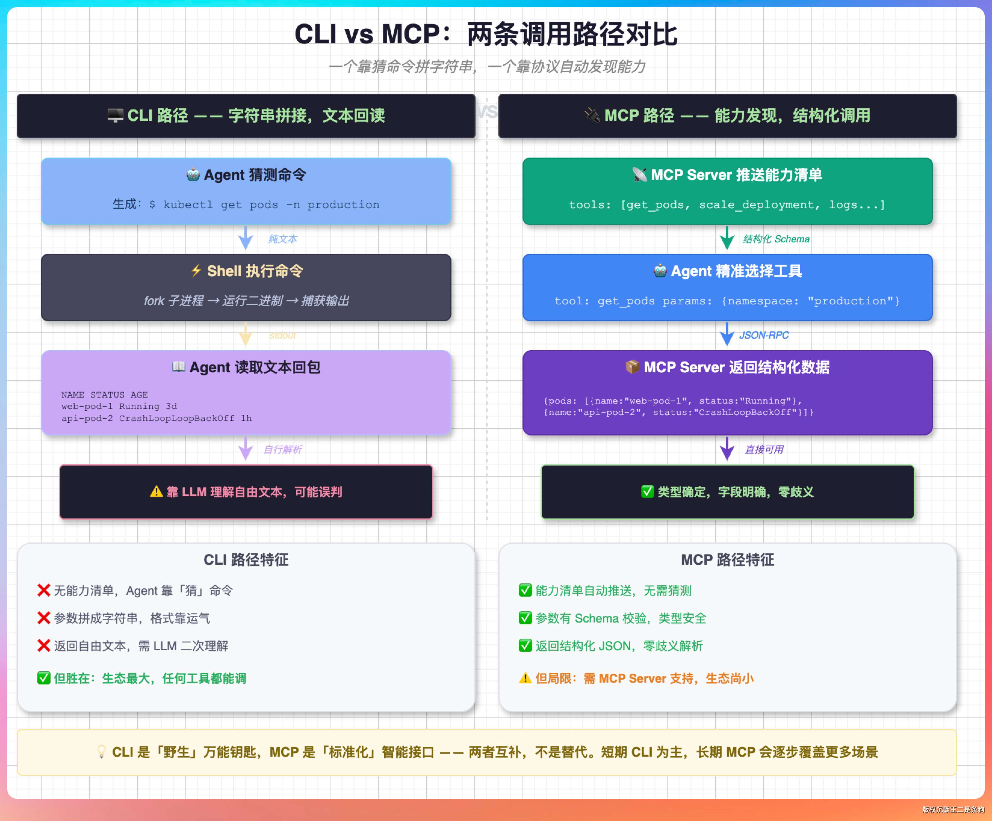 CLI 和 MCP 都站在 Agent 和底层能力之间,但处理同一件事的方式完全不一样。