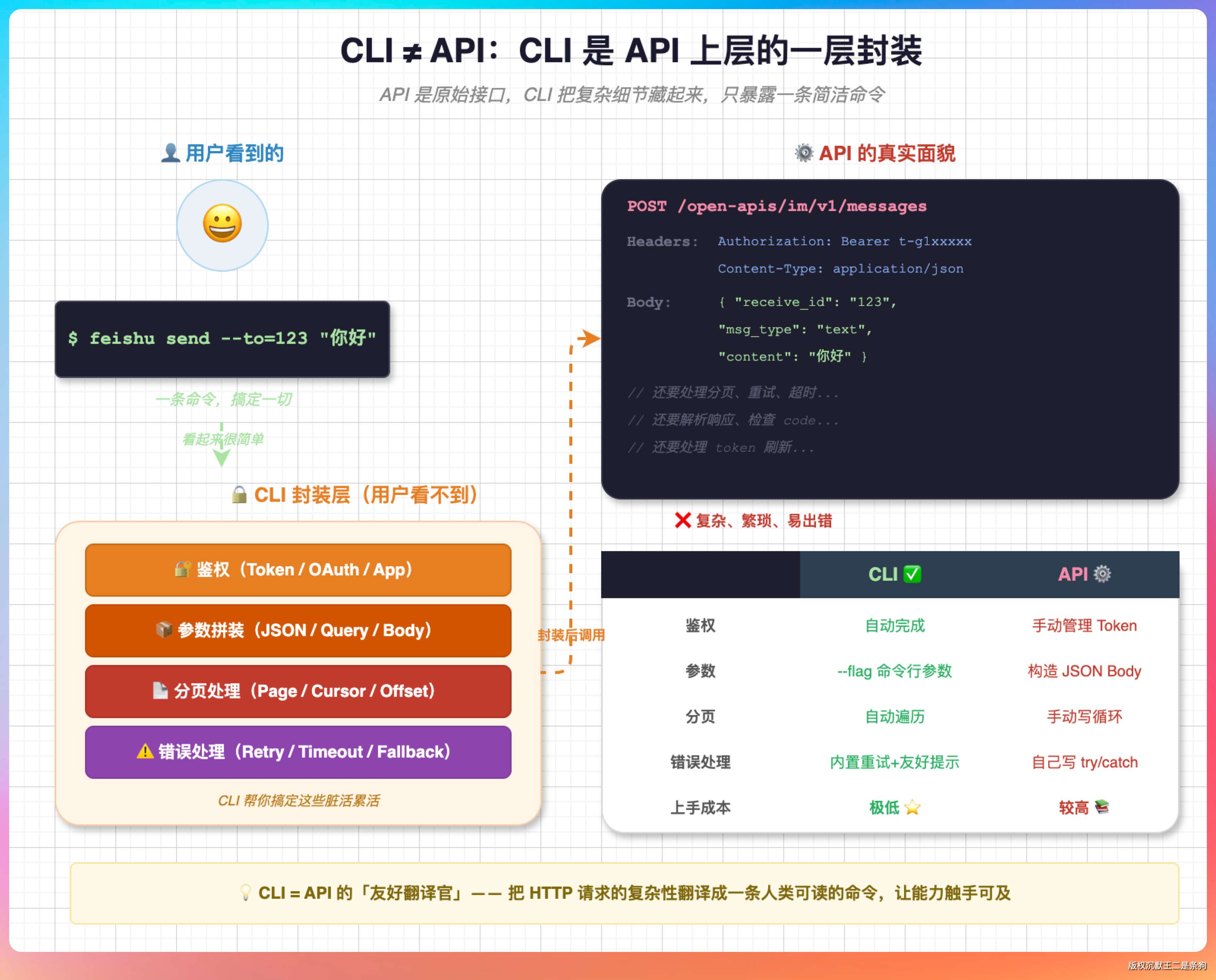 飞书 CLI 是对飞书 API 的一层包装。它把鉴权、参数拼装、分页、错误处理这些复杂细节处理掉,最后对 Agent 只暴露一条命令。