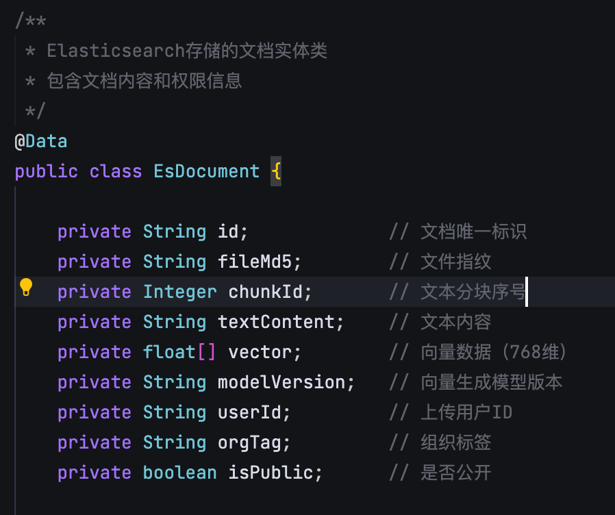 向量化这块是整个 RAG 系统的核心, VectorizationService 会调用豆包的 Embedding API 把文本转换成向量表示。我们选择把这些向量存储在 Elasticsearch 中,主要是因为 ES 在向量检索方面的性能比较好,而且支持混合检索。