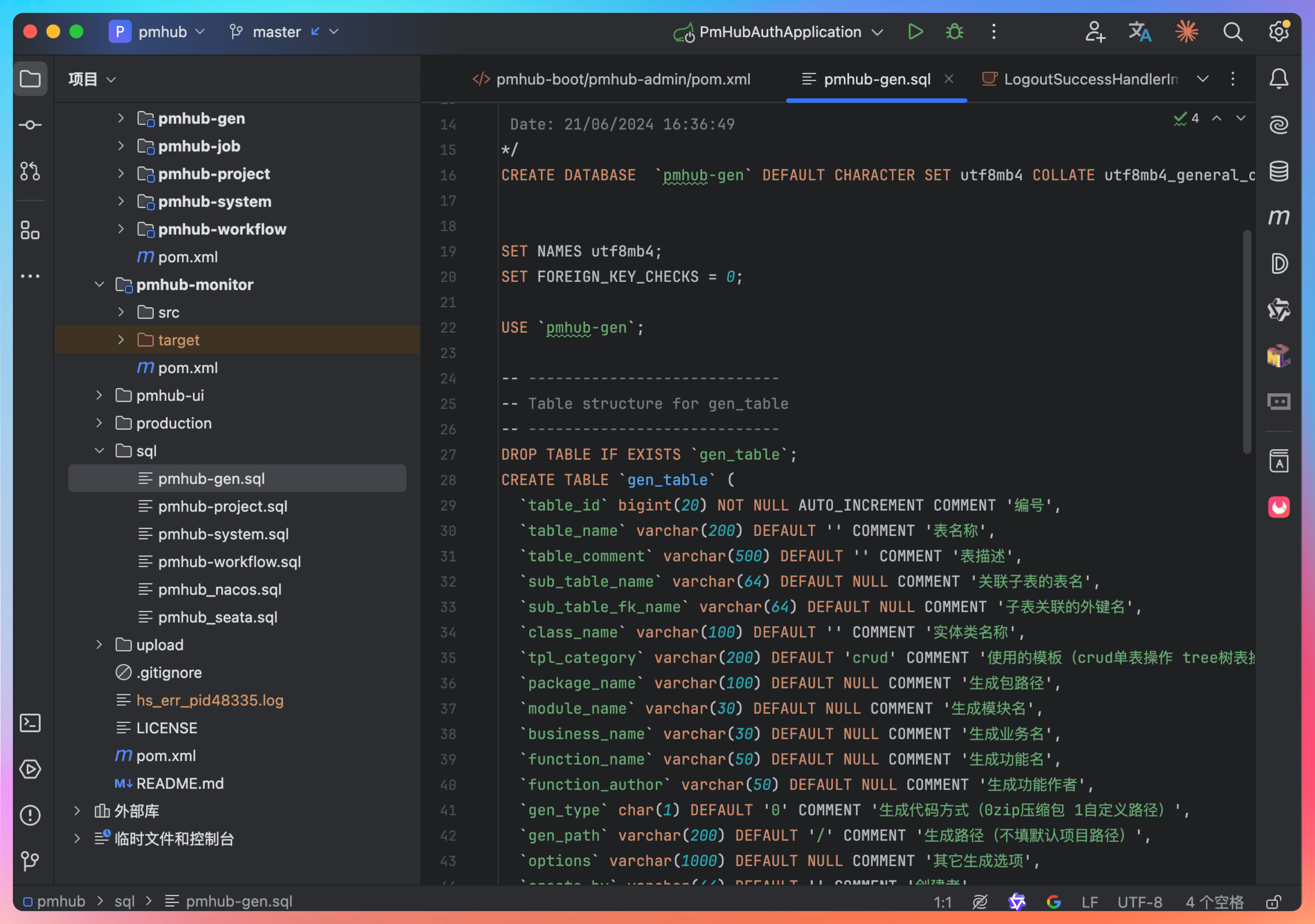 然后去 Nacos 看配置,确认数据库和 Redis 的连接没问题。启动顺序建议是 Auth → System → Gateway → Project → Workflow。